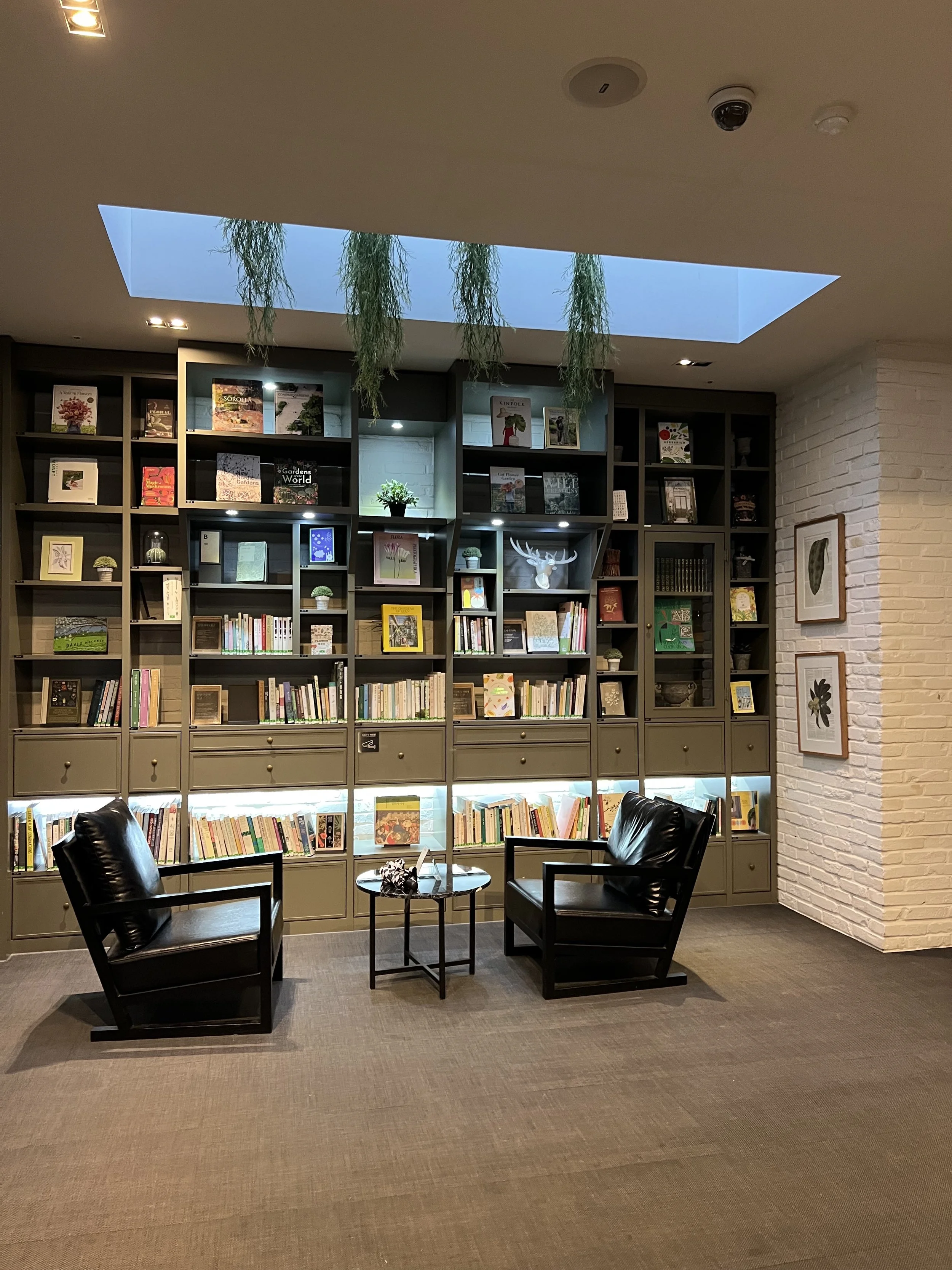 After my thoroughly enjoyable coffee break, I sat out in the gardens for a little while, taking in its beauty and thinking how talented whoever curated it is. The water features, landscaping, lighting and plants just seemed to live in such harmony. Walking back to my room, I popped into the library, which I had noticed earlier. “Wow! This is gorgeous”. I spent time with the eclectic collection of books old and new, again with this question playing on reel, who designed and curated this library collection? I raved about it to my family and went to bed with a smile celebrating the talent and creativity of whoever had put this all together and feeling gratitude for the gift of being here.